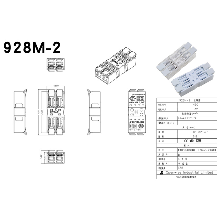 特点:928端子采用按压手柄,免螺丝接线,操作方便,接线快捷,可同时接单股或多股电线,928端子有宽版(含固定孔)/窄版供选择,1至3位可供选择,