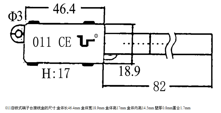 产品介绍:011接线盒是一款自锁式线盒,总长46mm宽18.9高17mm适配2拼8mm爬电距离的端子台PA8 PA7凹槽型,将端子台锁紧线后装入线盒中,将011端子台接线盒盒盖按下扣紧即可,使用十分方便快捷!011端子台线盒两端有两个固定孔,方便将接线盒固定在机壳壁板上.如果接线盒要求防水防尘,011接线盒的一端还可以加上胶管尾巴!这样组合起来符合IEC标准。011自锁式接线盒整体用PP料生产,防火阻燃达94V-2 通过ROHS、REACH等环保测试!