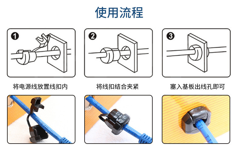 使用方法:先将电源线放置线扣内,扣上线扣,使用工具夹紧塞入机板出线孔,固定电源线