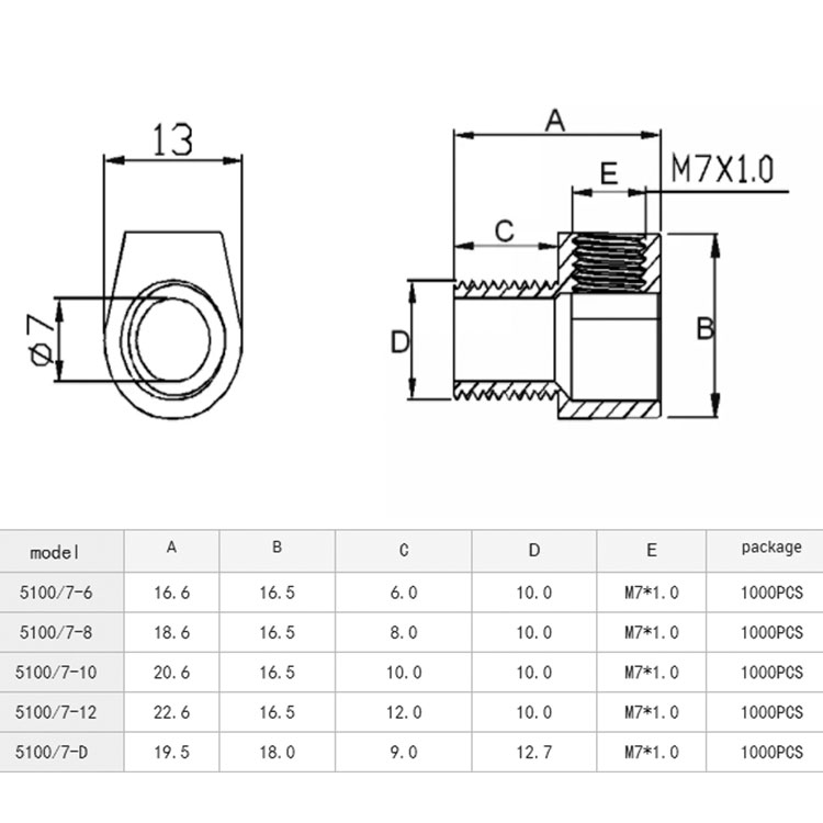 外螺纹:M10*1.0(可配套M10六角螺母)