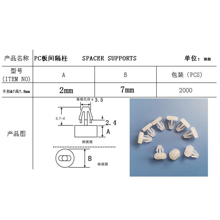 用途:支撑PC板,使中间不致震动,载重而凹陷短路。主要用于LED吸顶灯灯具铝基板等其他器具固定用。