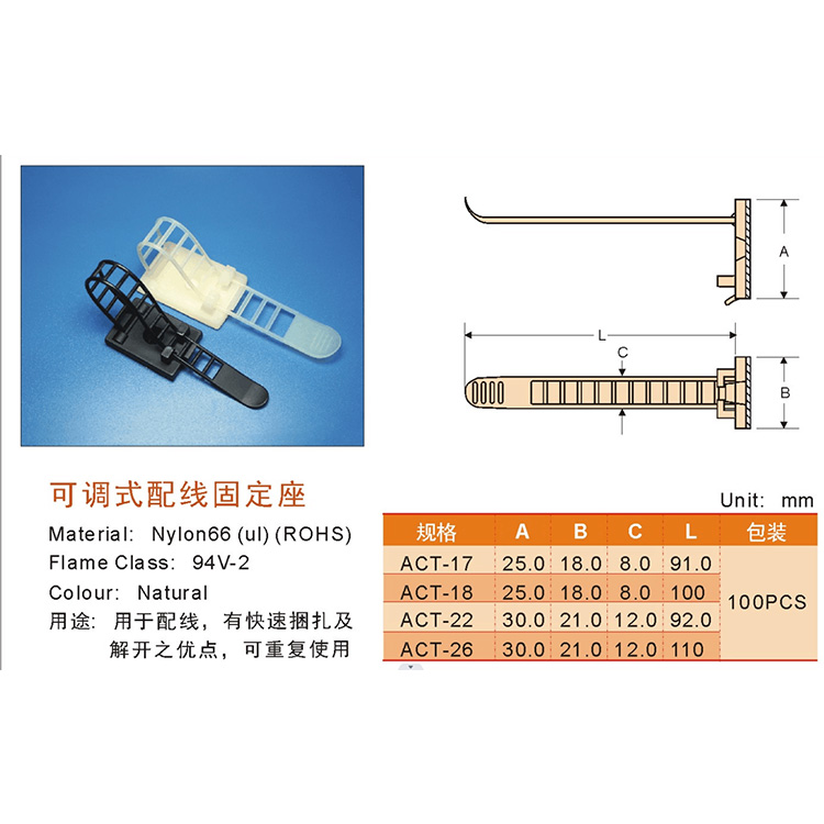 特点 : 绝缘,耐腐蚀,耐磨,重复使用,底部背胶,此扎带背面粘胶非常牢固粘上很难脱落,当一般扎带使用更好可以随意松解..广泛使用于机箱内部理线、工程布线束线,美观大方,采用阶梯式可调节设计,可根据线的大小进行调节束线,并可随意松解,非常实用