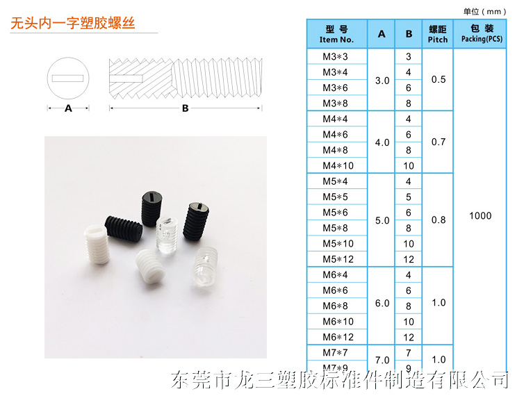 无头一字螺丝采用全新环保PC料制造,耐高低温,耐摩擦,可应用于机车加速器转轮,耐化学性(耐腐蚀,耐酸碱)高强度高韧性,不导电,不生锈,体积小,美观,安装方便,重量轻,无磁干扰,规格齐全;广泛用于电子,装饰,玩具,家电,室外工程,洗漱洁具,仪器仪表行业等。