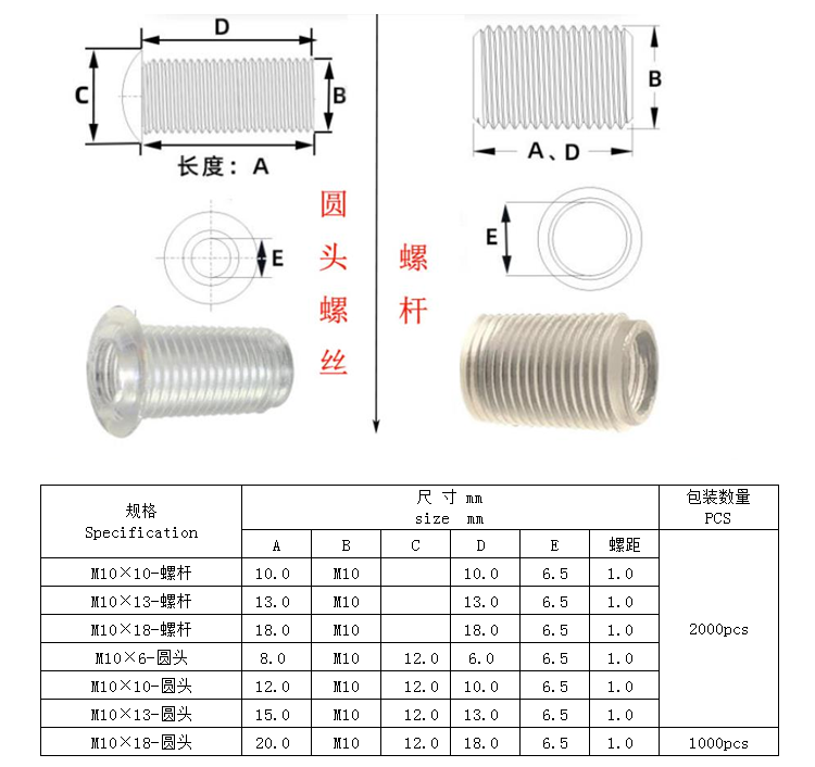 M10*18圆头塑料空心螺丝系列尺寸图:
