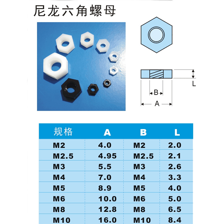 产品规格:尼龙六角螺母尺寸表: